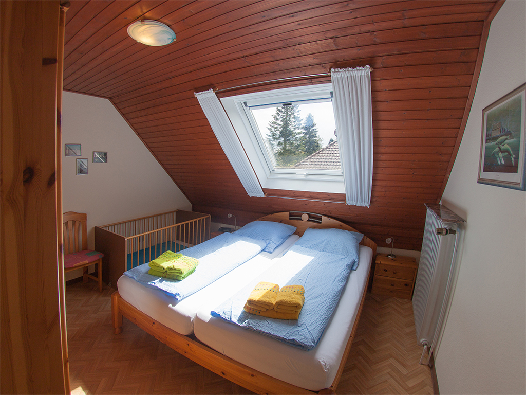 Im Schlafzimmer steht neben dem Ehebett (die Matratzen haben die Größe 90cm x 200cm) ein Kinderbett (70cm x 140cm).